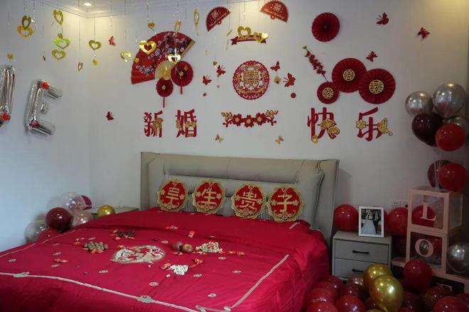走进三楼的新房,崭新的婚床撒满了寓意美好的干果,周围的家具和墙壁贴满了红色气球,喜气洋溢。马德蓉幸福地介绍说:“婚房是亲戚朋友帮着布置的,我特别满意,三楼还有单独的卫生间和阳台,不仅方便,还很宽敞。”