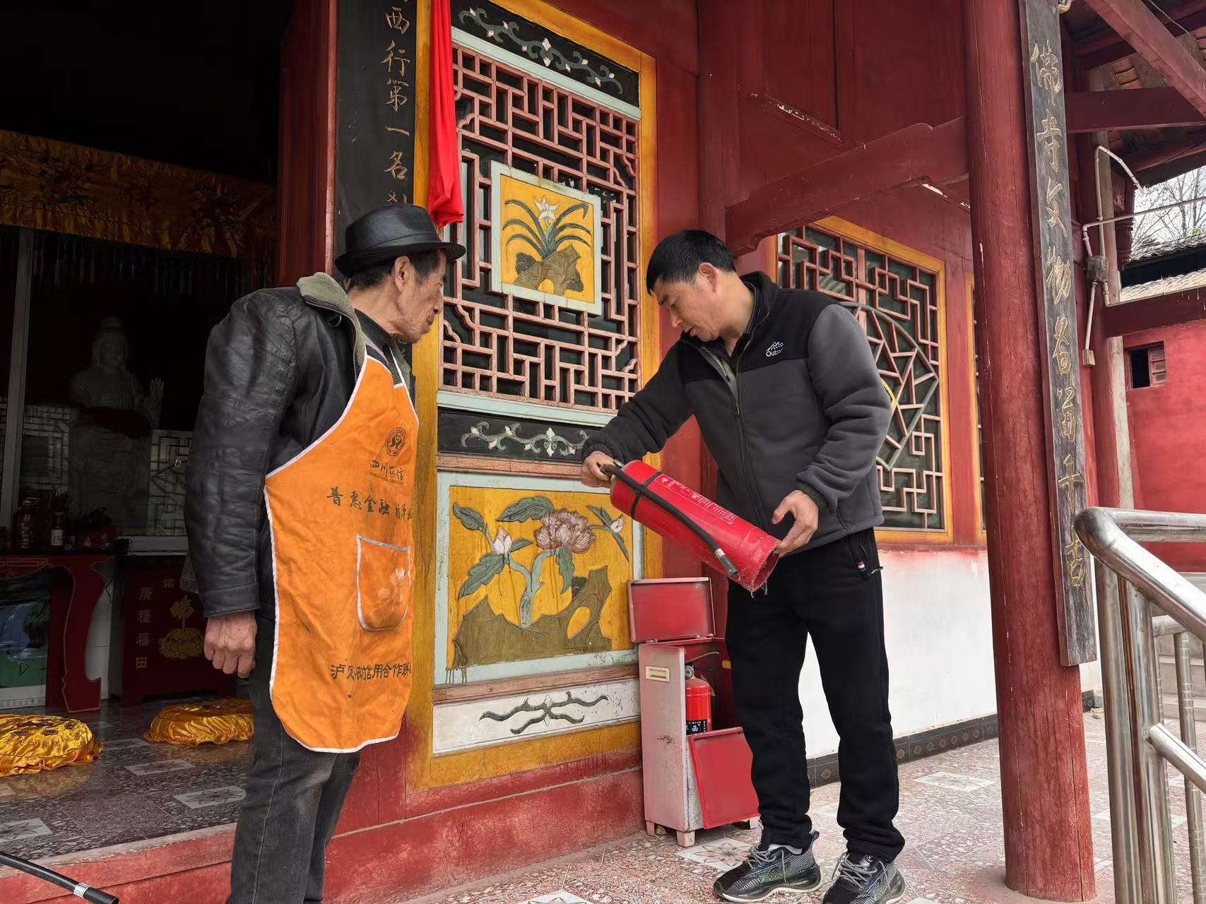 检查组逐一对辖区内各寺庙进行全覆盖走访,重点核查消防应急包是否配备齐全、物资是否完好,严格对照《消防设施通用规范》,检查灭火器、消防栓等器材的出厂日期与使用状态,确保未超出报废年限、压力正常可使用。同时,排查疏散通道是否畅通、电气线路是否规范等关键环节,现场向寺管人员宣讲消防安全知识。